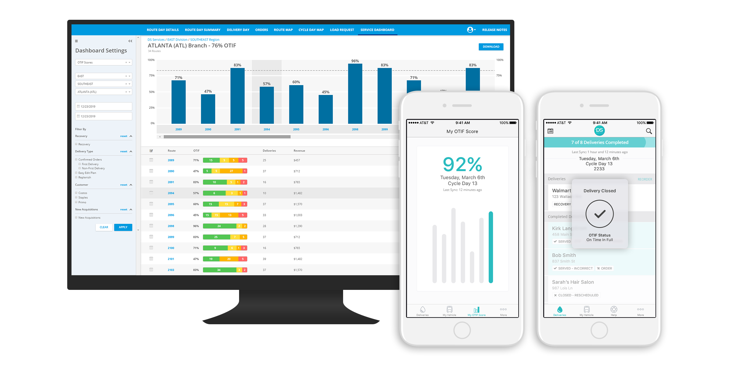 As an initial phase to quickly address these needs, we added a feature to view the OTIF score of a route and the OTIF statuses of its deliveries in our current route management dashboard screens. These current screens already had ways of filtering by type of deliveries and through the hierarchy of branches and routes.