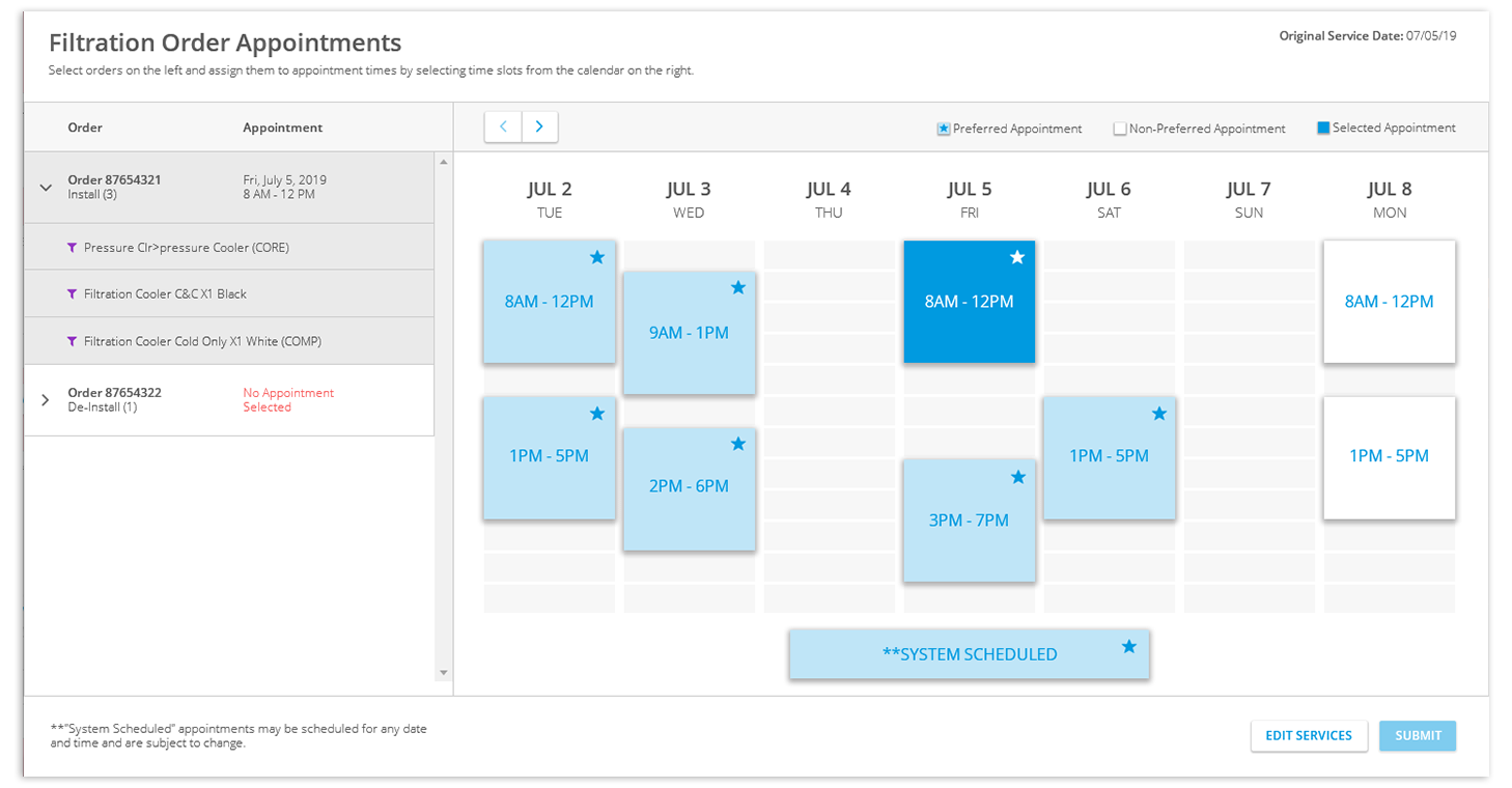 For instance, a customer may request a filter delivery as well as servicing for a leaky cooler, however, a leak technician may only be available for appointments Monday-Tuesday while a filter delivery route sales rep may only be available Wednesday - Friday. The call center agent would have to select 2 different appointments though they could schedule the 2 orders at the same time.