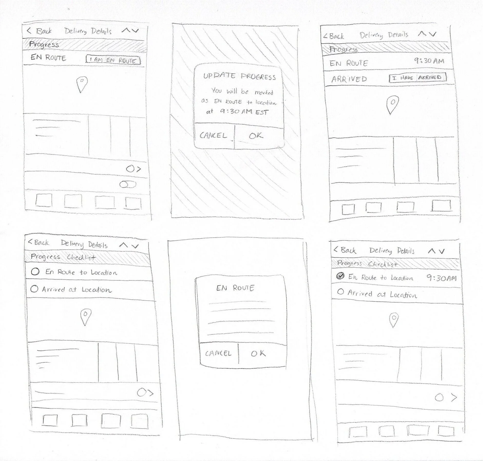 I consulted with our systems analysts about what terminology could be used for effective call-to-action’s. Words like “In Transit” and “On-Site” seemed to be terminology that is commonly used with our delivery driver users.