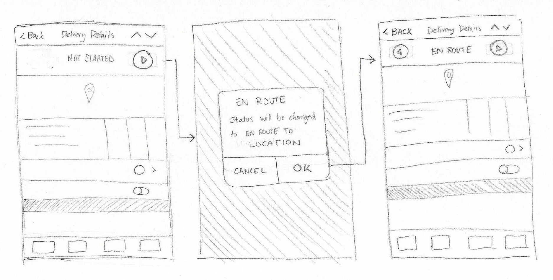 The buttons did not make it clear what action was next. We could show an alert, notifying the user on what was the next status, but the explanation seemed “after the fact” and the multiple alerts and taps required to dismiss them would slow the process down for a user who wanted to make deliveries as quickly as possible.