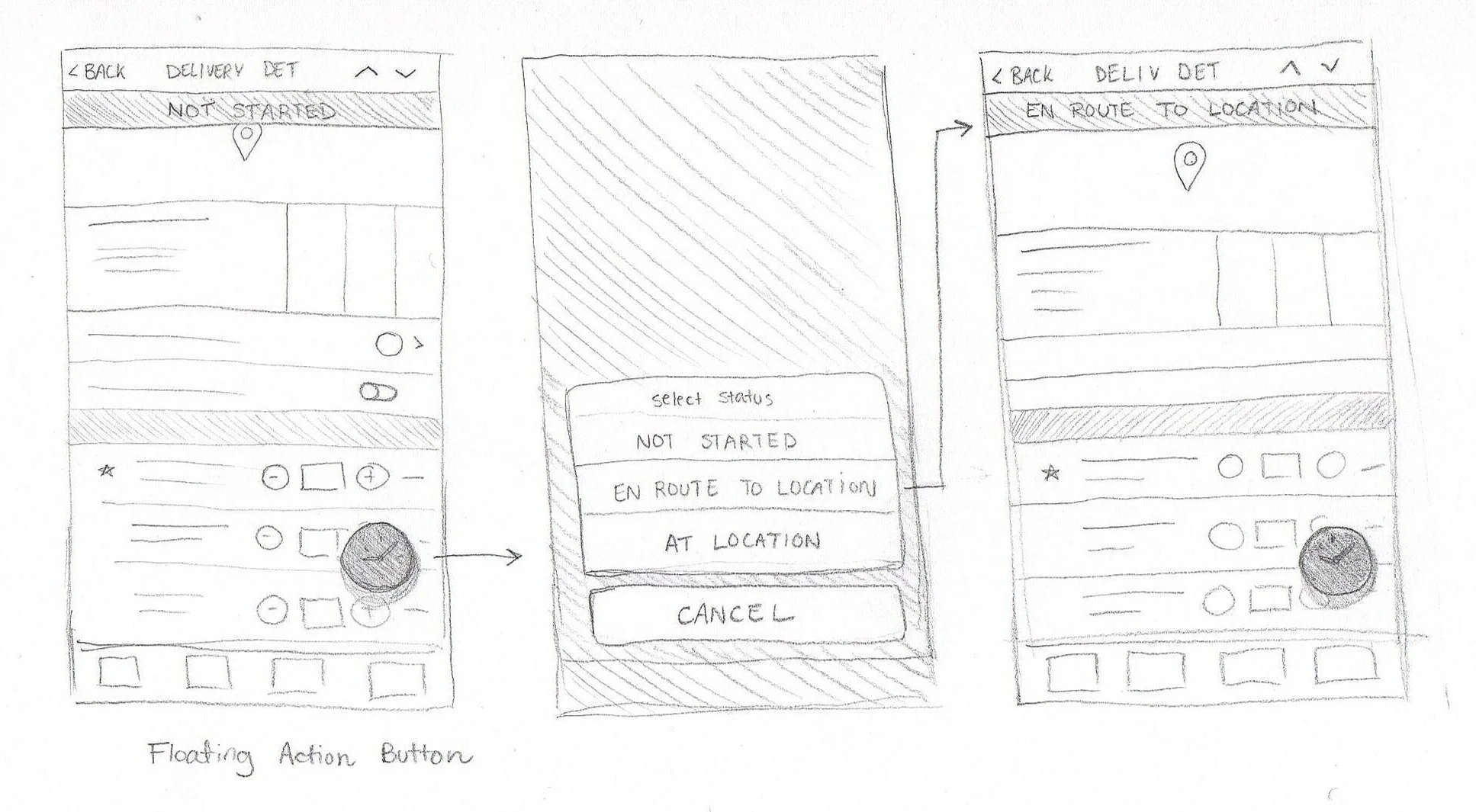 My manager prompted that a floating action button seemed to be a good way to prompt the user to update their status without impeding on the current structure of the screen. I sketched out ways we could display a floating action button.